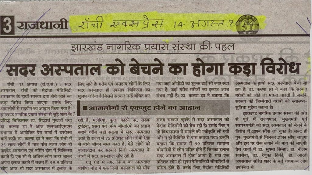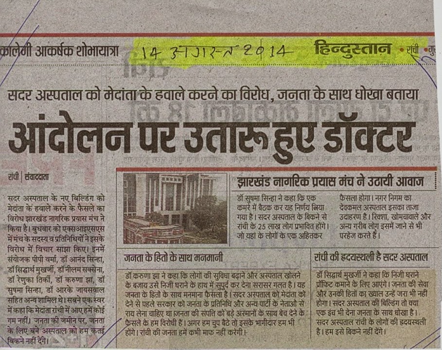 Soon after, activities such as street meetings, pamphlet distributions, and public actions were undertaken. By October and November 2014, protests were taking place at multiple sites in Ranchi, including near the hospital itself and at the Jharkhand Assembly. Prabhat Khabar and Dainik Bhaskar reported on demonstrations where activists held placards warning against PPP, explaining to people that privatisation would mean higher charges and fewer free services.