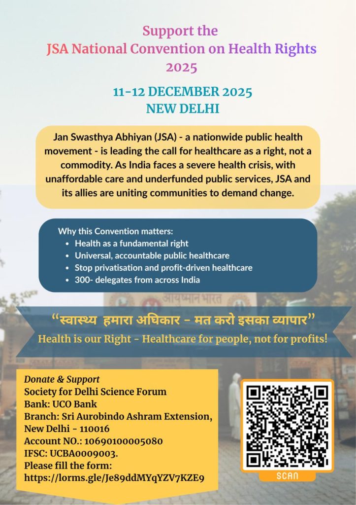 To address the current situation and advocate for health as a fundamental right, the National Convention on Health Rights, being organised by Jan Swasthya Abhiyan (JSA) in collaboration with various national networks and civil society organisations, on 11-12 December 2025 at Jawahar Bhavan, New Delhi.